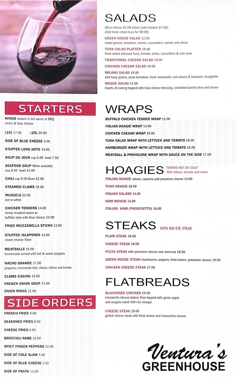 Ventura's Greenhouse Restaurant offers a menu that strikes a balance between classic Italian comfort and casual dining favorites, all set within a warm, inviting atmosphere. Whether you're stopping by for a relaxed lunch, gathering for an evening meal with friends, or enjoying drinks at the bar, the menu presents a variety of options that feel at home in this lively yet comfortable setting.
